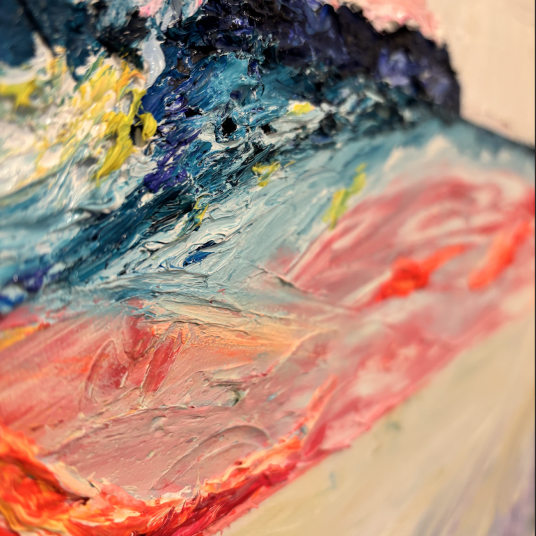 Peintures à l’huile sculpturées, céramiques et peintures sur soie composent un univers pluriel, où les techniques se répondent et se complètent. L’huile permet la profondeur, la 3D et la lenteur, la céramique ancre la forme dans la matière, tandis que la soie accueille la couleur dans sa plus grande fragilité.